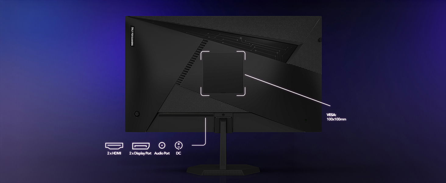 100×100mm VESA, 2xHDMI 2.0, 2xDP, and Audio Out for flexible setup and device compatibility.